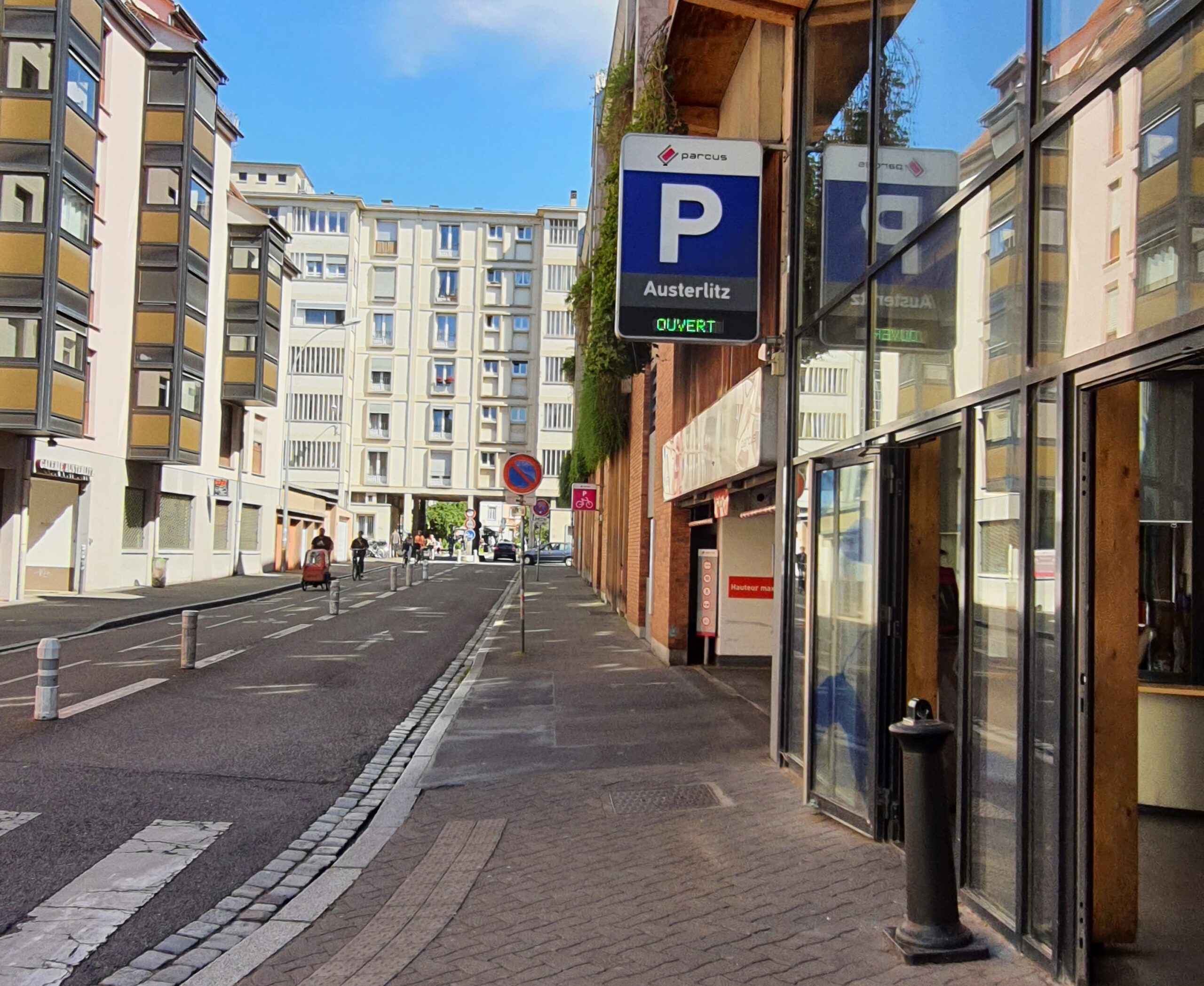 La rénovation du parking Austerlitz a été placée sous le signe du respect de l’environnement : choix des matériaux (bois, verres), façade végétalisée, luminaires à faible consommation d’énergie doublés de détecteurs de présence, création de chéneaux de sortie à l’arrière du bâtiment, mise en place de panneaux photovoltaïques sur 224 m2 de la toiture et production de miel grâce aux 5 ruches installées sur l’avant toit. La signalétique est signée du designer Ruedi Baur qui a réalisé des cyanotypes à partir des végétaux présents dans le parc pour décorer le parking. Ce parking a obtenu le Trophée des Entreprises Publiques Locales en 2010 et a remporté, en 2011, un Award décerné par l’European Parking Association.